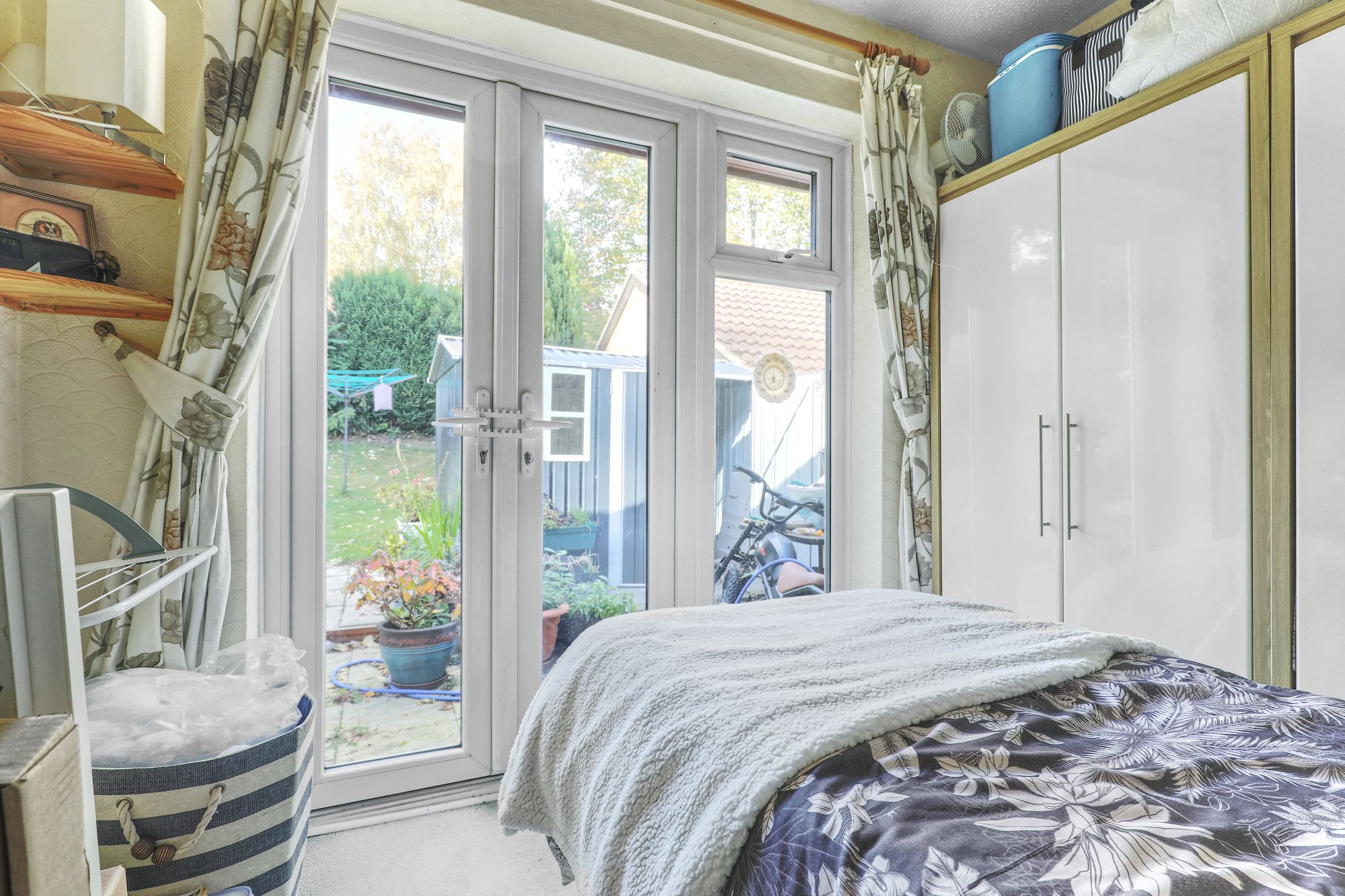 Both bedrooms are well-proportioned with one benefitting from built-in storage and the other offering French doors that open directly onto the attractive communal rear garden — ideal for enjoying a morning coffee or quiet moments outdoors. The bathroom currently includes a refitted walk-in shower.