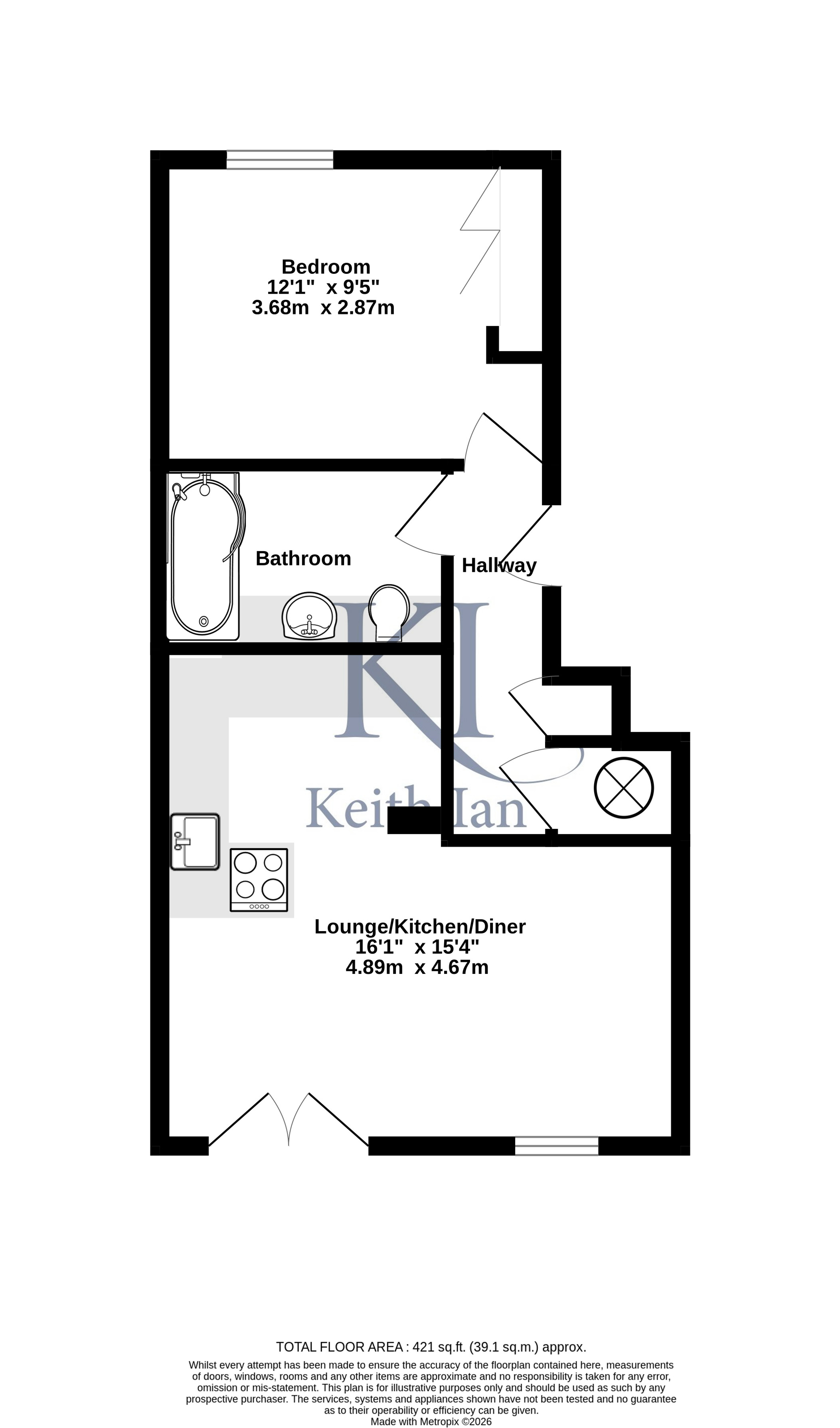 Keith Ian are pleased to bring to market this well-presented chain-free one-bedroom flat, offering modern accommodation arranged across a practical and well-designed layout, ideally suited to owner occupiers and investors alike. The property benefits from a bright open-plan living space with wood flooring and good natural light. The kitchen area is fitted with black gloss units, wooden worktops, and white subway tile splashbacks, providing ample storage and workspace. The living area further benefits from air conditioning and a ceiling fan, while French doors open out and enhance the sense of space and connectivity. The double bedroom is well-proportioned and finished with wood flooring and neutral décor, allowing for flexible furnishing. The bathroom is modern in style and fitted with a walk-in shower, freestanding basin, and heated towel rail, complemented by white subway tiling and wood-effect flooring.