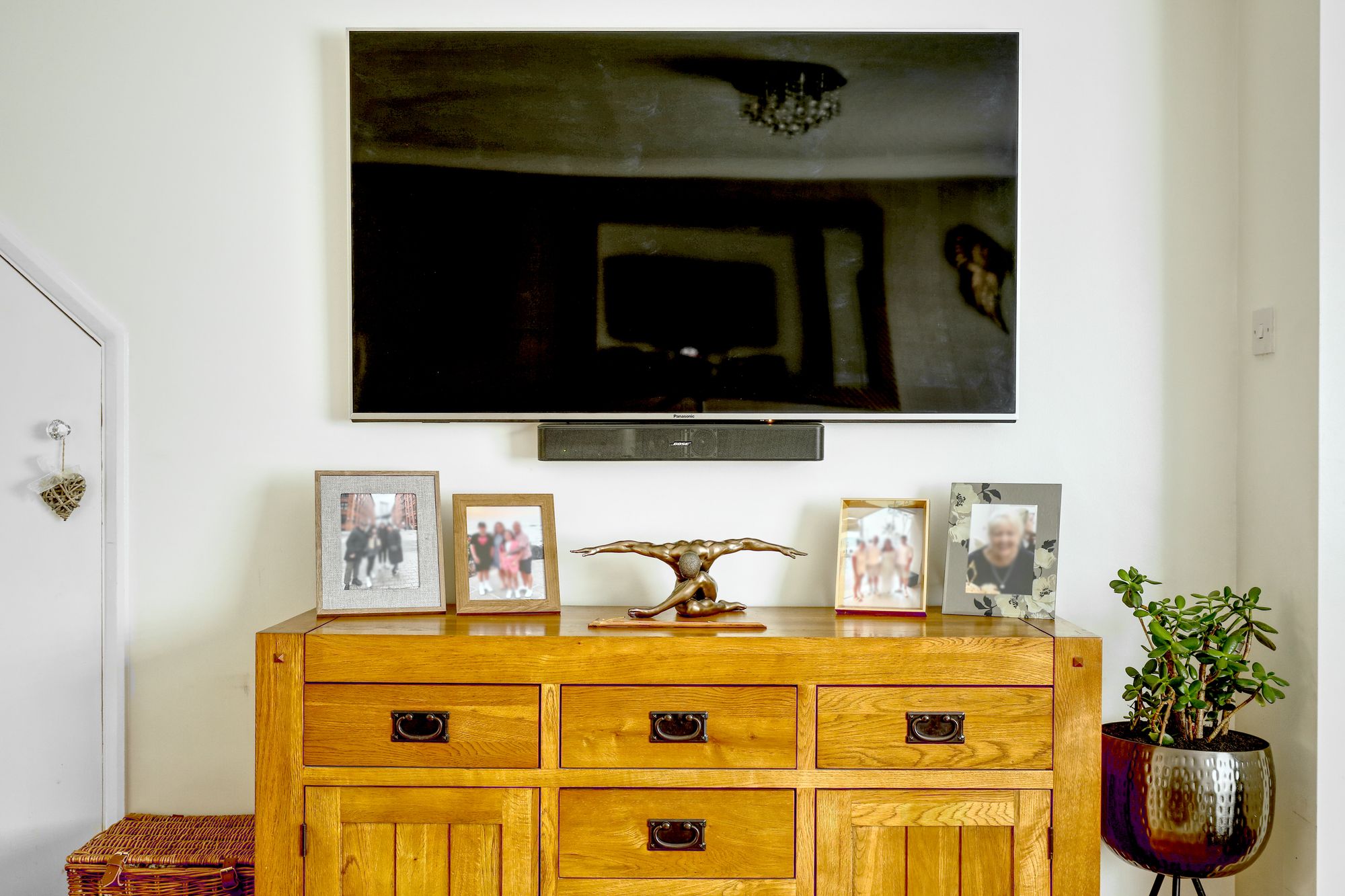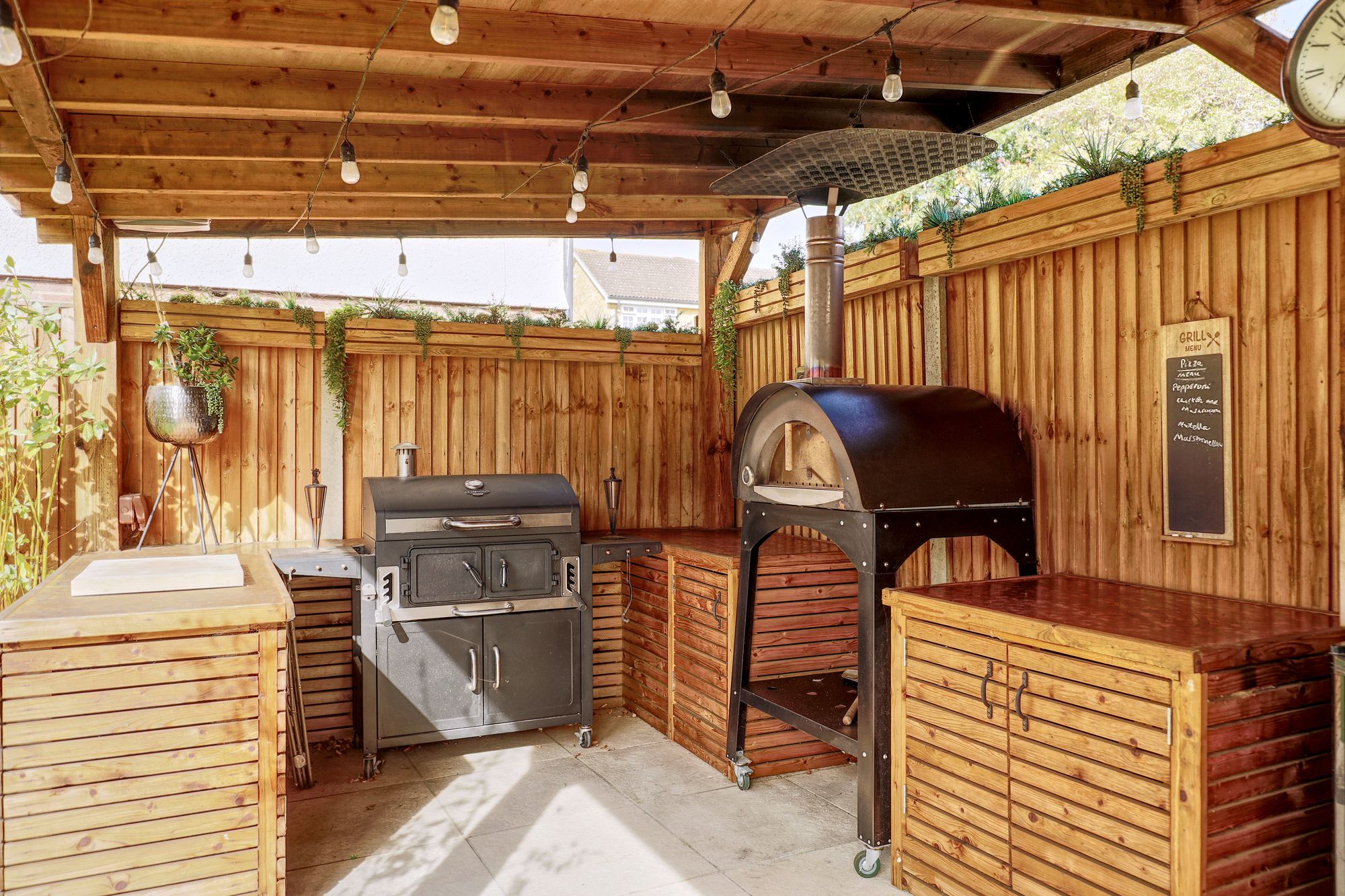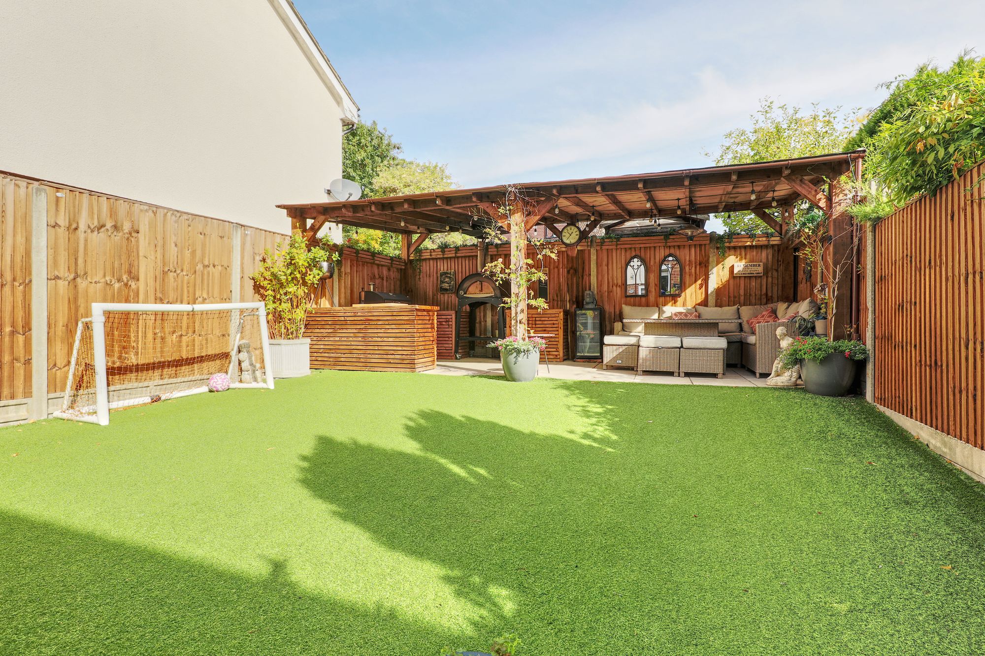 Outdoor living reaches new heights with multiple entertainment zones, including a charming covered seating area beneath a wooden pergola. Enjoy alfresco dining with a wood-fired pizza oven and barbecue grill, complemented by a private patio adorned with raised garden beds. The spacious, low-maintenance garden features an artificial lawn, wooden fencing for privacy, and ambient lighting, creating the perfect setting for both lively gatherings and serene evenings. The front of the property offers off-street parking via a private driveway and a secure garage for storage purposes, with a well-maintained front garden and modern facade enhancing kerb appeal.