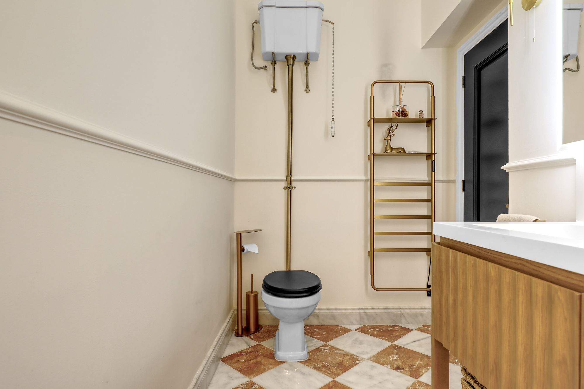 There are two well-proportioned bedrooms, both finished in neutral tones. The principal bedroom is a comfortable double room with duel aspect windows and space for additional bedroom furniture. Bedroom two is currently arranged as a home office, making it ideal for those working from home, while remaining easily adaptable as a second bedroom. The bathroom is finished with marble flooring (AND SKIRTING) and combines classic styling with modern fittings, including a walk-in shower, double basin, contemporary vanity unit, gold fittings, and a backlit mirror.
