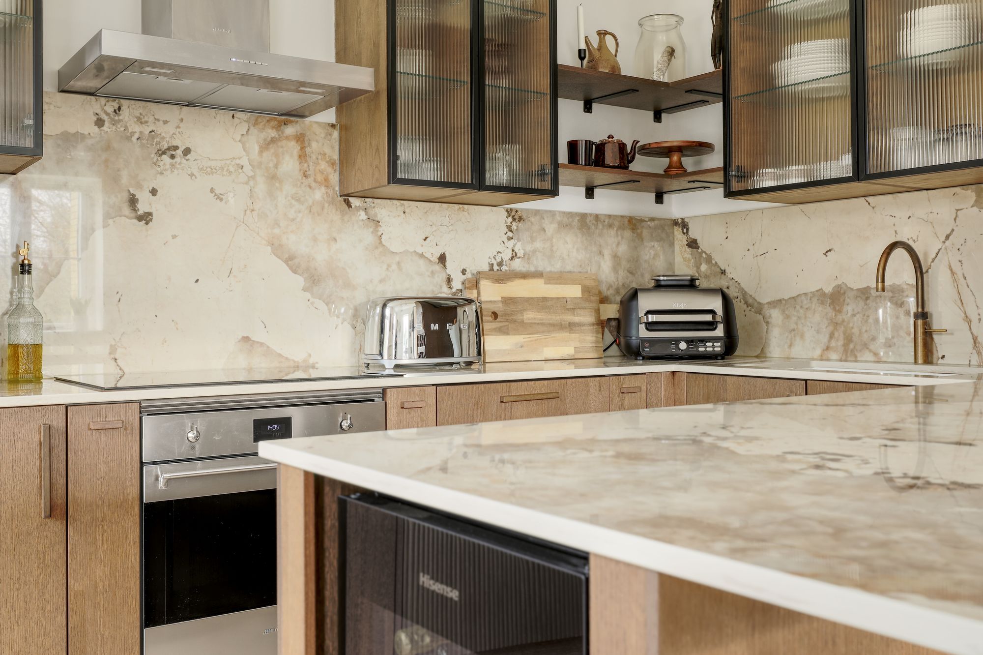 A modern fitted kitchen featuring sleek units, integrated appliances, quartz worktops, and a central island offering additional workspace and informal seating. Finished with herringbone flooring and contemporary lighting.